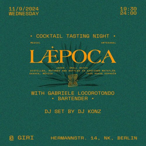 A cocktail night dedicated to the tasting of the organic artesanal Mezcal “Laepoca” with Gabriele Locorotondo • Bartender who will mix some of his signature cocktails using the “Laepoca” Mezcal at Giri Bar. Beside this a djset of a mexican dj : DJ KONZ, free food Tostada with Pico de Gallo and a Photo Exhibition.