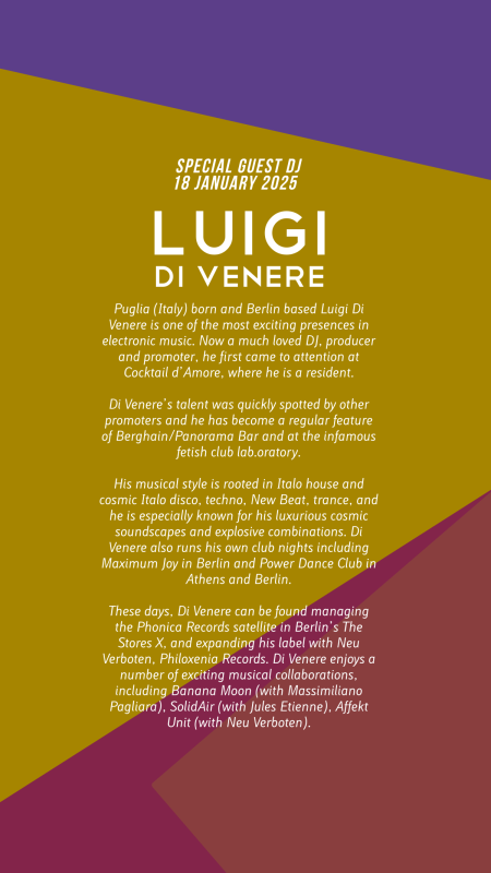 An unforgettable DJ set by Luigi Di Venere, regular DJ at Berghain, from 22:00 to 1:30 am,