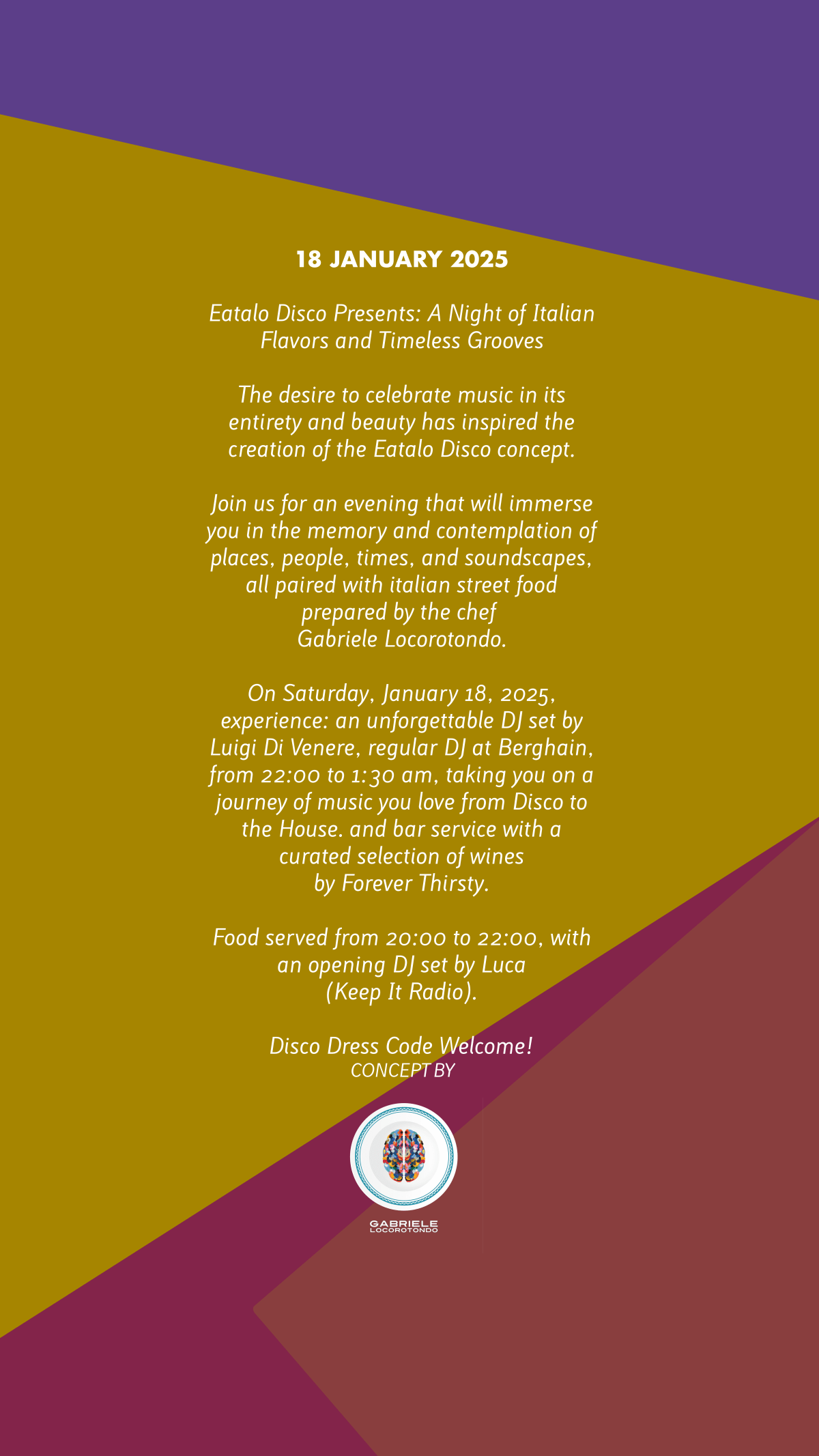 The desire to celebrate music in its entirety and beauty has inspired the creation of the Eatalo Disco concept. Join us for an evening that will immerse you in the memory and contemplation of places, people, times, and soundscapes , all paired with iconic and tasty Italian street food prepared by the chef Gabriele Locorotondo.